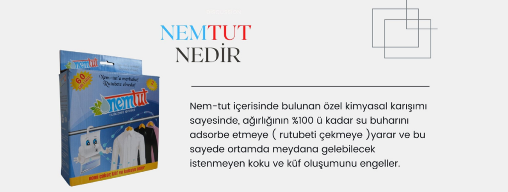 Nem-Tut içerisinde bulunan özel formülü sayesinde ağırlığının %100 ü kadar su buharını adsorbe etmeye ( nemi ve rutubeti çekmeye ) yarar ve bu sayede ortamda meydana gelebilecek istenmeyen kötü koku ve küf oluşumunu , metal yüzeylerde ki korozyonu engeller.